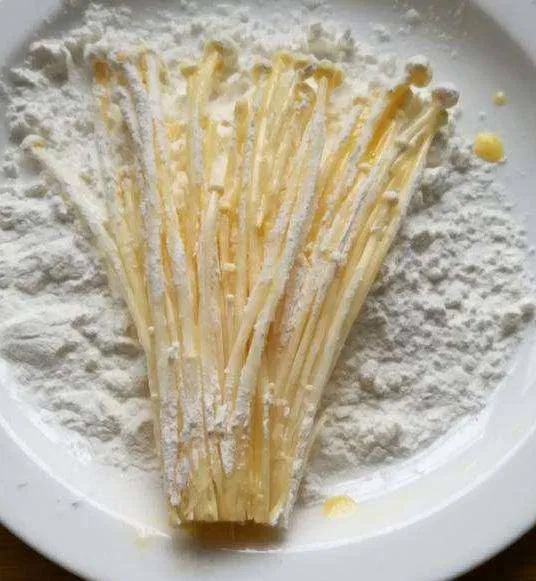 4.นำเห็ดเข็มทองมาคลุกแป้งให้ทั่ว