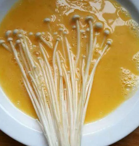 3. จากนั้นนำเห็ดเข็มทองที่เตรียมไว้จุ่มลงไปในไข่