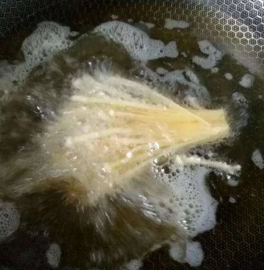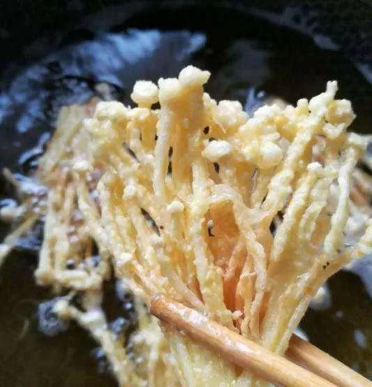5. ใส่น้ำมันลงในกระทะตั้งไฟจนร้อน หลังจากนั้นก็เอาเห็ดเข็ม ลงไปทอดไฟไม่ต้องแรงมากนะค่ะ เดี๋ยวไหม้