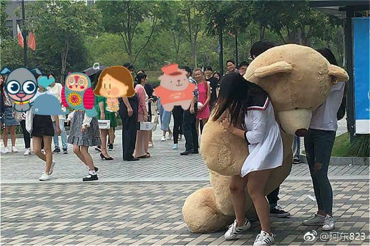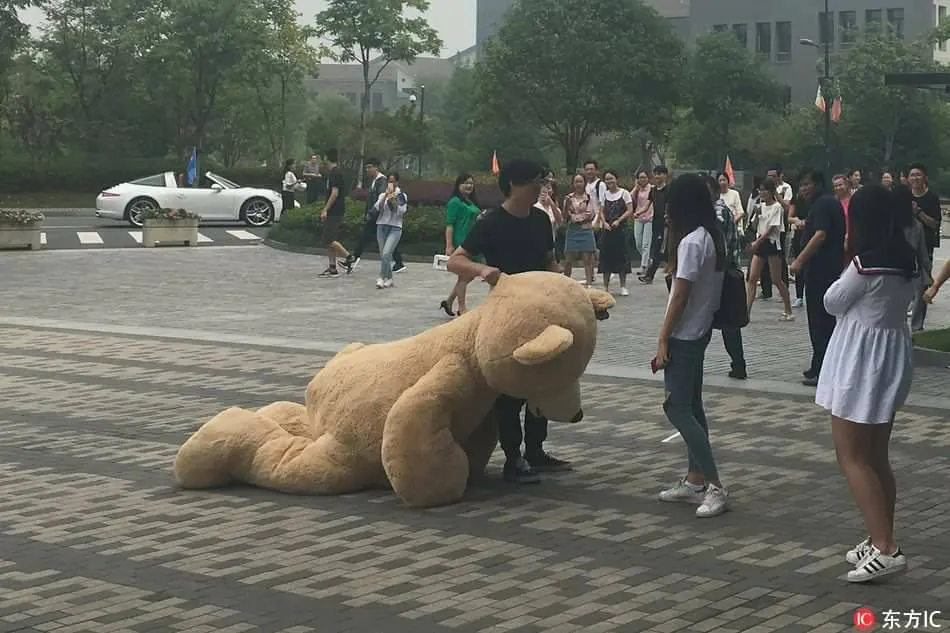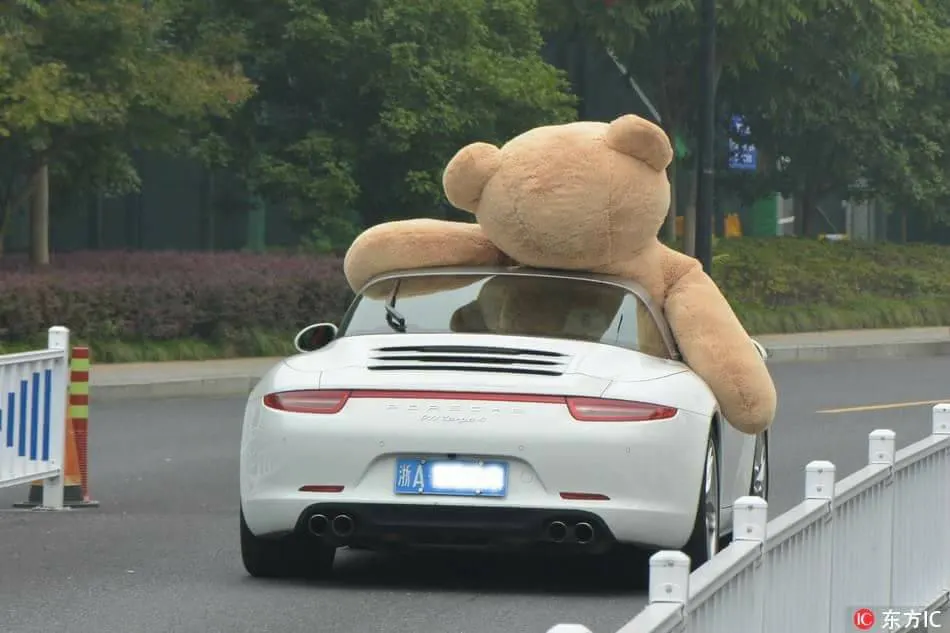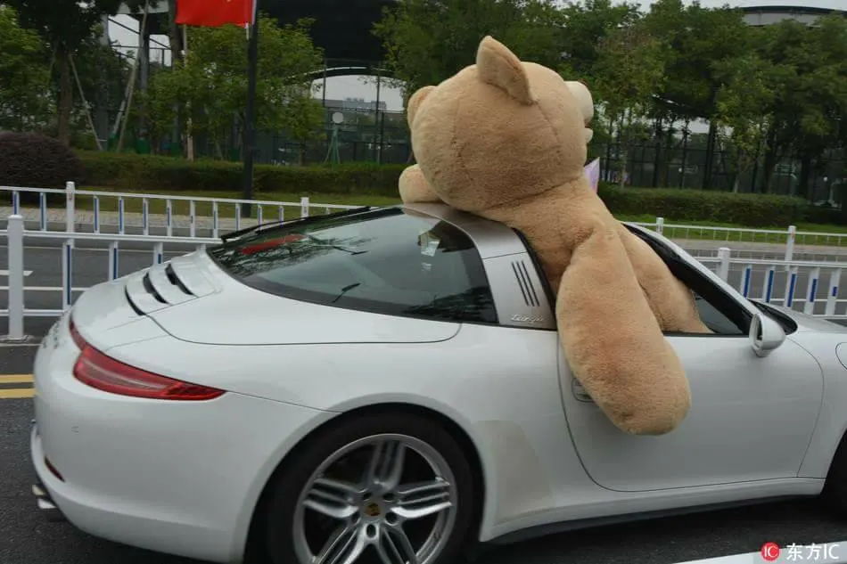 เพจอ้ายจงได้เผยแพร่ภาพถ่าย หนุ่มจีนบ้านรวย ขับรถปอร์เช่สุดหรู พาตุ๊กตาหมีตัวยักษ์ สูง 2.5 เมตร มาให้สาวจีนที่แอบชอบ ในมหาวิทยาลัยแห่งหนึ่งในเมืองหังโจว มณฑลเจ้อเจียง