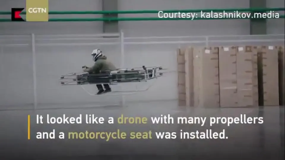 บริษัทคาลาชนิคอฟ ผู้ผลิตอาวุธรายใหญ่ของรัสเซีย เปิดตัว “มอเตอร์ไซค์บินได้” ซึ่งเป็นคอนเซ็ปต์เดียวกับรูปแบบของโดรน สังเกตได้จากการติดใบพัดจำนวนมากไว้โดยรอบ และติดตั้งที่นั่งแบบรถจักรยานยนต์เพิ่มเข้าไปตรงกลาง สามารถให้คนขึ้นไปนั่งได้ 1 คนและยังสามารถบังคับทิศทางการบินได้จากที่นั่งคนขับอีกด้วย