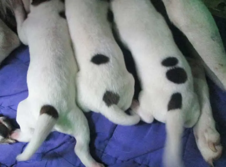 ลูกหมาสามตัวที่เกิดมาพร้อมจุดตามจำนวน
