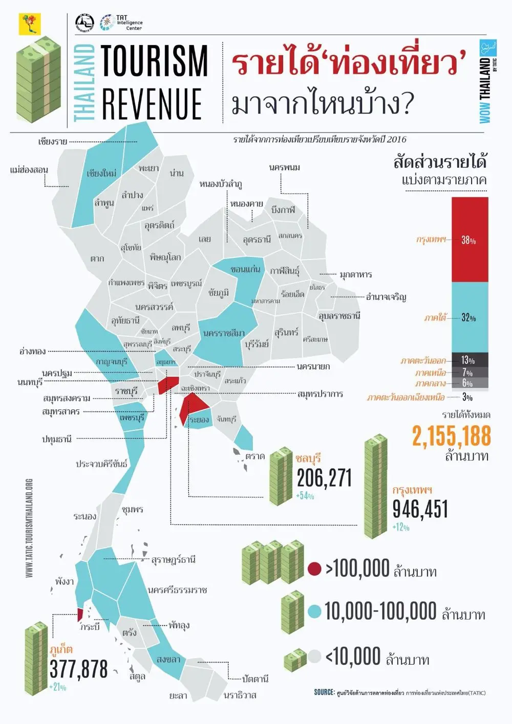 อุตสาหกรรมท่องเที่ยวไทยนั้นสร้างรายได้เป็นอันดับต้นของประเทศ โดยในปี 2016 ทั้งอุตสาหกรรมทำรายได้รวมถึง 2,155,188 ล้านบาท #WowThailand จึงชวนมาเจาะลึกรายได้ท่องเที่ยวไทยลงไปอีกขั้น ด้วยรายได้ทางการท่องเที่ยวจากแต่ละจังหวัดทั่วประเทศในปีที่ผ่านมา