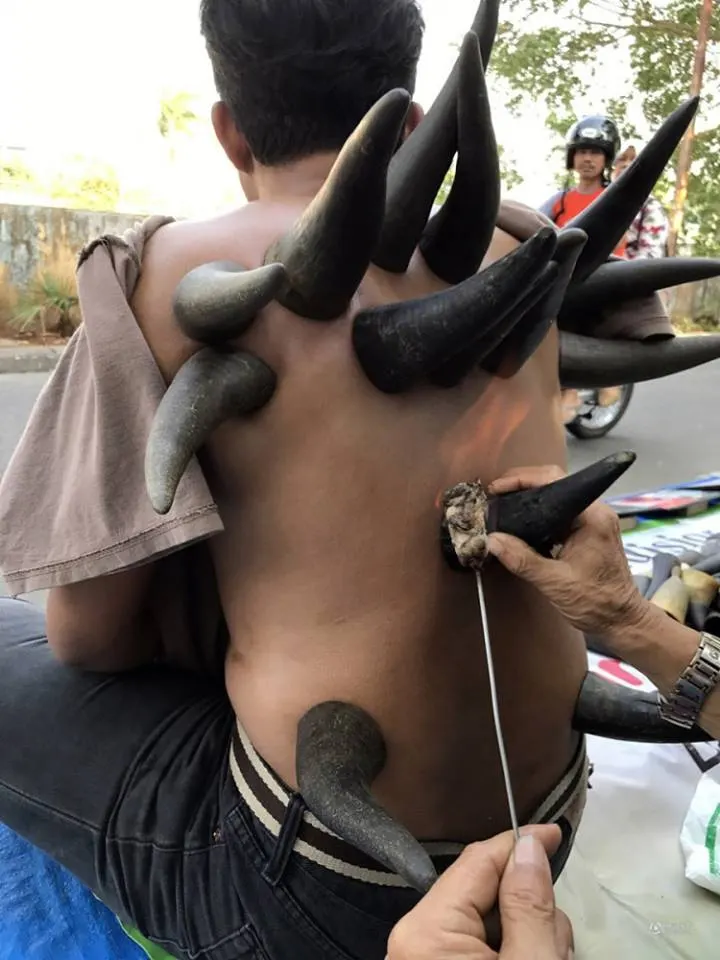 เป็นที่ตกใจของหลายคนหลังได้เห็นภาพการรักษาโรคทางเลือกที่คล้ายๆกับการครอบแก้วของจีนแต่ใช้ “เขากระบือ” แทน โดยในภาพเป็นชายคนหนึ่งบริเวณริมถนนในกรุงจาการ์ตา ประเทศอินโดนีเซีย