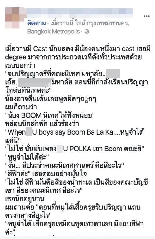 30 กันยายน 2560 เพจ ANTI SOTUS ได้เผยแพร่สเตตัสของรุ่นพี่ ม.ดังสุดๆ คนหนึ่ง ที่ได้สัมภาษณ์ระหว่างการ แคสงานแสดง ของเด็กจบใหม่คนหนึ่งที่จบคณะนิเทศ มหาวิทยาลัยเดียวกับตนเองมา
