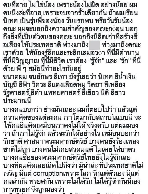 แต่การสัมภาษณ์ไม่ได้อย่างใจรุ่นพี่คนนี้เลย เพราะให้บูมคณะก็ไม่ได้ ถามข้อมูลเกี่ยวกับคณะ และมหาวิทยาลัย ก็ไม่ค่อยรู้ ลั่น ไม่รู้จักมหาวิทยาลัยแบบนี้ แล้วจะรักมหาวิทยาลัยได้อย่างไร ลามไปถึงว่า เพราะแบบนี้ไงประเทศชาติถึงไม่เจริญ