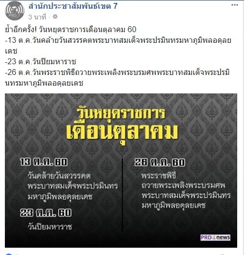 เฟซบุ๊ก สำนักประชาสัมพันธ์เขต 7 โพสท์เฟซบุ๊ก ย้ำอีกครั้ง! เรื่อง วันหยุดราชการเดือนตุลาคม 60