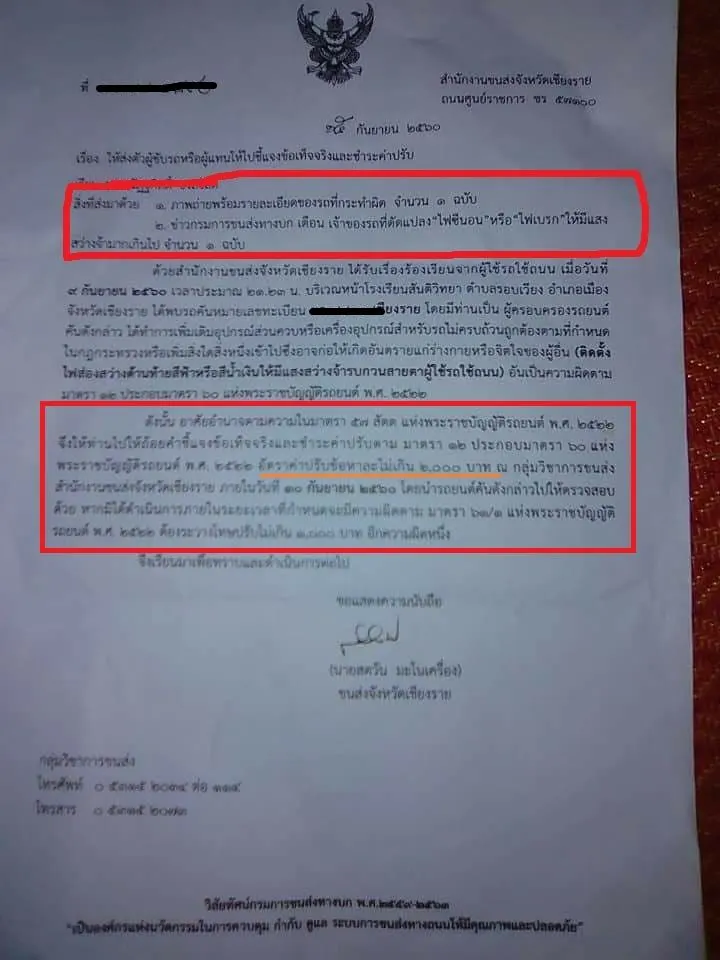 เจ้าหน้าที่ตำรวจและกรมขนส่งแนะนำให้ถ่ายรูปรถพร้อมป้ายทะเบียนให้ชัดเจน แล้วส่งหลักฐานให้กับกรมขนส่งเพื่อดำเนินการตามกฏหมาย ซึ่งต้องเสียค่าปรับไม่เกิน 2,000บาท และต้องนำรถมาให้ตรวจสอบว่าแก้ไขแล้วหรือไม่