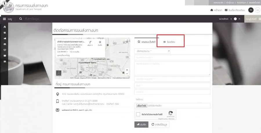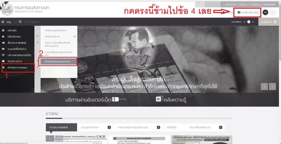 2. เอาเม้าส์มาชี้ๆแถบเครื่องมือด้านซ้าย จะมี Menu เลื่อนออกมา ให้เลือก "ติดต่อเรา/เสนอแนะ" แล้วเลือก "ติดต่อกรมขนส่งทางบก" (ดูตามรูป)