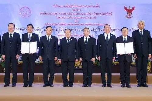 พลเอก ประวิตร วงษ์สุวรรณ (ที่ 4 จากซ้าย) และ พลเรือเอก ณรงค์ พิพัฒนาศัย (ที่ 4 จากขวา) รองนายกรัฐมนตรี ให้เกียรติร่วมในพิธีลงนามความร่วมมือระหว่าง กระทรวงพัฒนาสังคมและความมั่นคงของมนุษย์ โดย พลตำรวจเอก อดุลย์ แสงสิงเเก้ว รัฐมนตรีว่าการฯ (ที่ 3 จากซ้าย) และ สำนักงานคณะกรรมการกิจการกระจายเสียง กิจการโทรทัศน์ และกิจการโทรคมนาคมแห่งชาติ โดย พลอากาศเอก ธเรศ ปุณศรี ประธาน กสทช. (ที่ 3 จากขวา) ด้วยการสนับสนุนของ กลุ่มทรู โดย นายวิเชาวน์ รักพงษ์ไพโรจน์ กรรมการผู้จัดการใหญ่ (ร่วม) ด้านการพาณิชย์ (ซ้ายสุด) ในการจัดทำระบบการรับแจ้งเหตุช่วยเหลือคนไทยในต่างประเทศและการค้ามนุษย์ผ่าน SMS และเลขหมายโทรศัพท์เบอร์เดียวทั่วโลก คือ +66 99 130 1300 ณ ตึกสันติไมตรี ทำเนียบรัฐบาล
