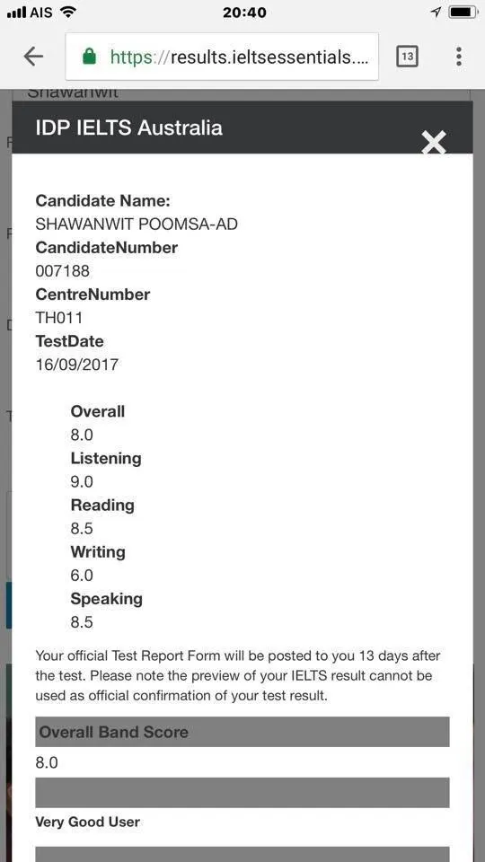 Congratulations! เด็กชายชวัลวิทย์ ภูมิสะอาด (Bonus) ม.2/14 EP, KKW ผ่านการสอบ IELTS เป็นการสอบวัดระดับภาษาอังกฤษนานาชาติที่เป็นมาตรฐานสากลของมหาวิทยาลัยต่างๆทั่วโลก ได้คะแนนรวมในระดับ 8 หรือ C1 ตามมาตรฐาน CEFR (คะแนนเต็มสูงสุดของ IELTS คือระดับ 9 )