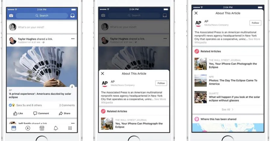 เฟสบุ๊คได้มีการทดสอบฟีเจอร์ใหม่เพื่อใช้ตรวจสอบข่าวบน News Feed ว่าข่าวนั้นเป็นข่าวปลอมหรือไม่ โดยการเพิ่มปุ่ม i (Information) ขึ้นมาด้านล่างของข่าว เมื่อผู้ใช้ทำการกดที่ปุ่ม i ระบบจะแสดงข้อมูลอื่นที่เกี่ยวข้องกับข่าว ว่าแหล่งข่าวมาจากที่ไหน ข้อมูลที่มาเกี่ยวกับแหล่งข่าวนั้นๆ รวมถึงข่าวนี้มีสำนักข่าวไหนนำเสนออีกบ้าง อีกทั้งระบบยังแสดงตำแหน่งที่อยู่ด้วยว่าข่าวนี้มีการแชร์มาจากที่ใด ถ้าระบบจับได้ว่าข่าวนั้นไม่มีความน่าเชื่อถือ ระบบก็จะไม่แสดงข่าวอื่นๆ ที่เกี่ยวข้องกับข่าวนี้อีกเลย