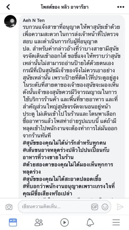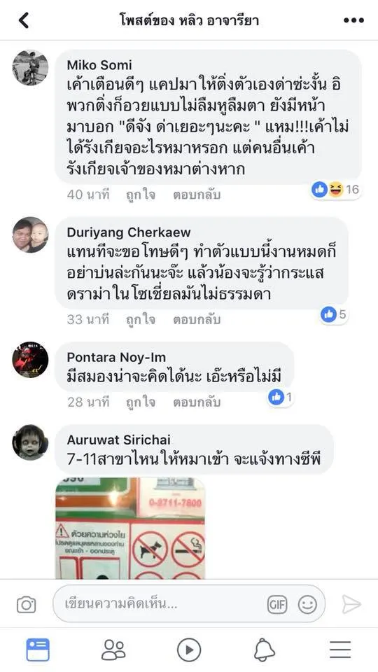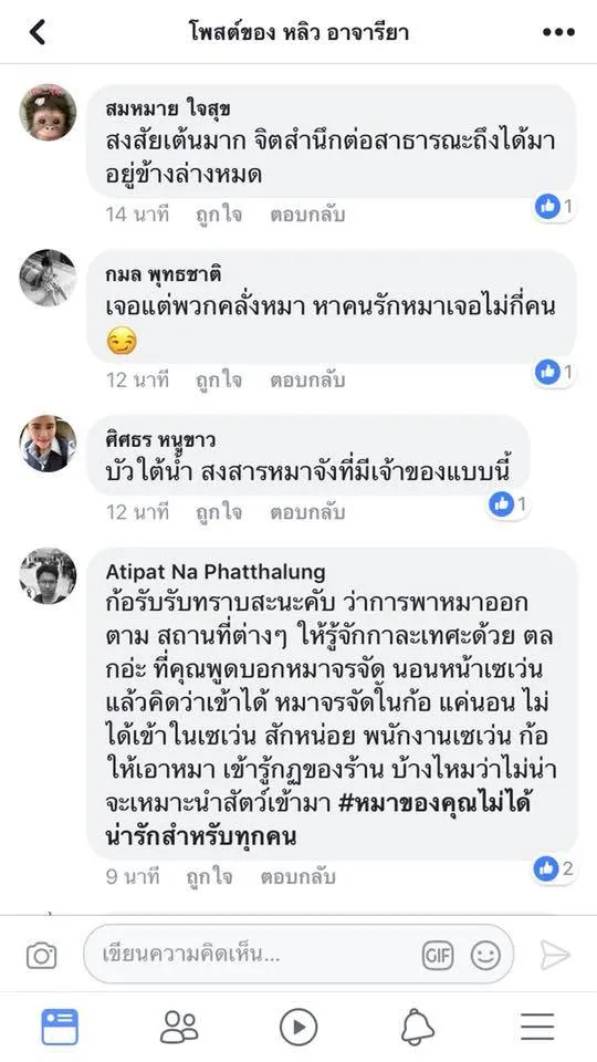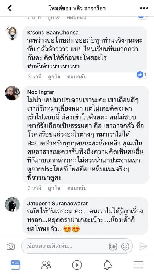 หลิวต้องขอโทษจริงๆ อย่างแรกหลิวยอมรับว่าหลิวผิดจริงๆ ที่ผิดกฎ นำน้องหมาเข้าไปในสถานที่ที่ห้ามนำเข้า หลิวขอยอมรับผิดและขอโทษจริงๆ อย่างที่สองหลิวต้องขอโทษทุกๆคนที่เข้ามาคอมเมนท์ตักเตือน และหลิวตอบคอมเมนท์ที่ไม่ดีกลับไป หลิวผิดจริงๆ อันนี้ก็ต้องขอโทษทุกๆคนจริงๆ หลิวขอโทษคะ