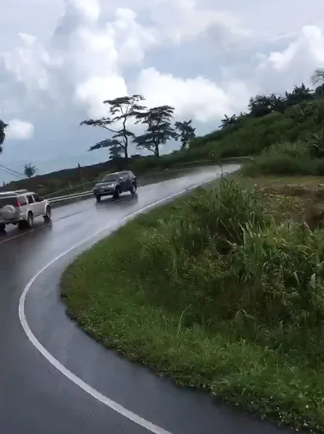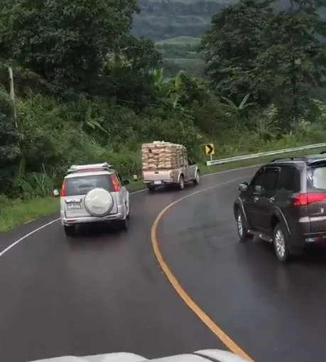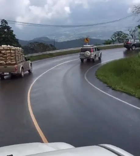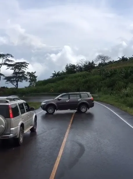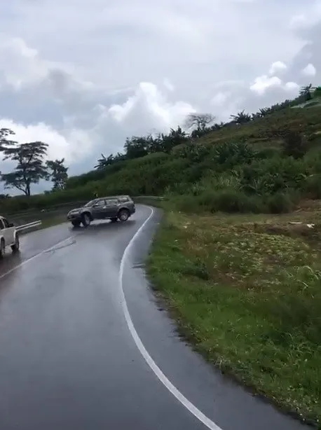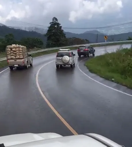 คลิประทึก ถนนลื่น(เปียก) แซงทางโค้งบนเขาทีเดียว 3 คันรวด อยู่ๆก็ขับถอยหลังซะงั้น