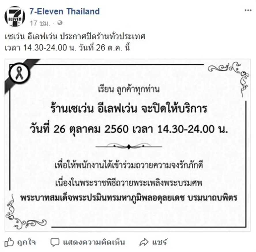 7-11 ปิดทุกสาขา ทั่วประเทศ 26 ต.ค.60