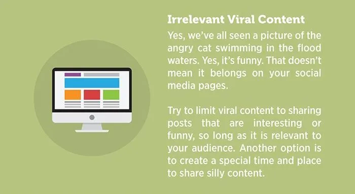 คลิปวิดีโอน้องหมาน่ารักๆ หรือแมวที่ทำตัวตลกๆ ใครเห็นก็ขำ และมียอดแชร์ถล่มถลาย แม้ไวรัลนี้จะน่าสนใจ แต่ถ้าไม่เกี่ยวกับแบรนด์ คุณก็ไม่ควรนำมาโพสต์ แต่ถ้าอยากโพสต์จริงๆ ลองกำหนดวัน หรือแคมเปญพิเศษ เชิญชวนกลุ่มเป้าหมายมาแชร์คลิปตลกๆ ด้วยกัน เช่น “วันศุกร์แล้วจะแชร์อะไรก็ได้” หรือ “เสาร์สนุก แชร์สั่น” เป็นต้น