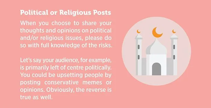 ประเด็นเรื่องการเมือง และศาสนานั้นค่อนข้างอ่อนไหว การโพสต์แสดงจุดยืนหรือความคิดเห็น อาจไม่ส่งผลดีต่อแบรนด์เท่าไรนัก แต่ถ้าคิดจะโพสต์ ควรเตรียมรับมือกับความคิดเห็นที่แตกต่าง และวิธีจัดการกับความขัดแย้งนั้นๆ