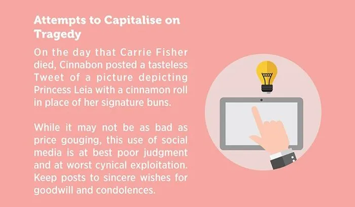 เราเชื่อว่าไม่มีแบรนด์ไหนอยากถูกพูดถึงในเชิงลบ การทำตลาดโดยเกาะกระแสคนดัง หรือใช้ประโยชน์จากเหตุการณ์สะเทือนใจคงไม่ใช่เรื่องที่ควรทำ หากต้องการใช้ Social Media กับเหตุการณ์เหล่านี้ ควรเป็นการแสดงความปรารถนาดี หรือแสดงความเสียใจ หลีกเลี่ยงการออกความคิดเห็นต่างๆ