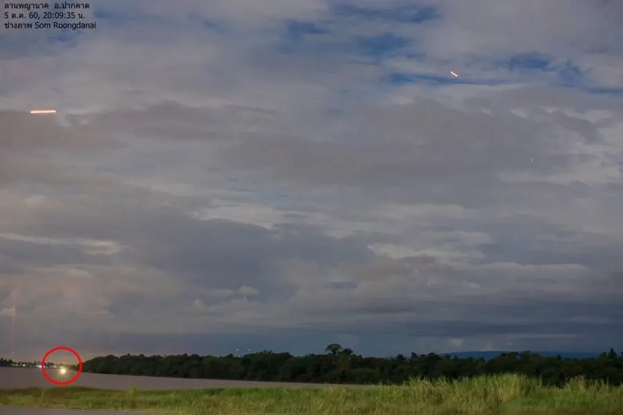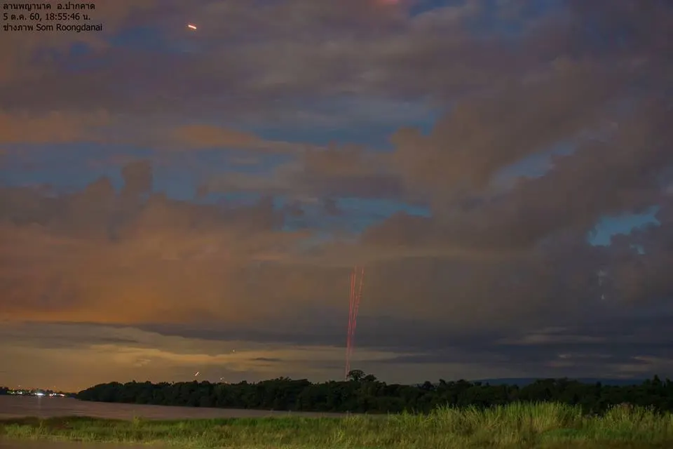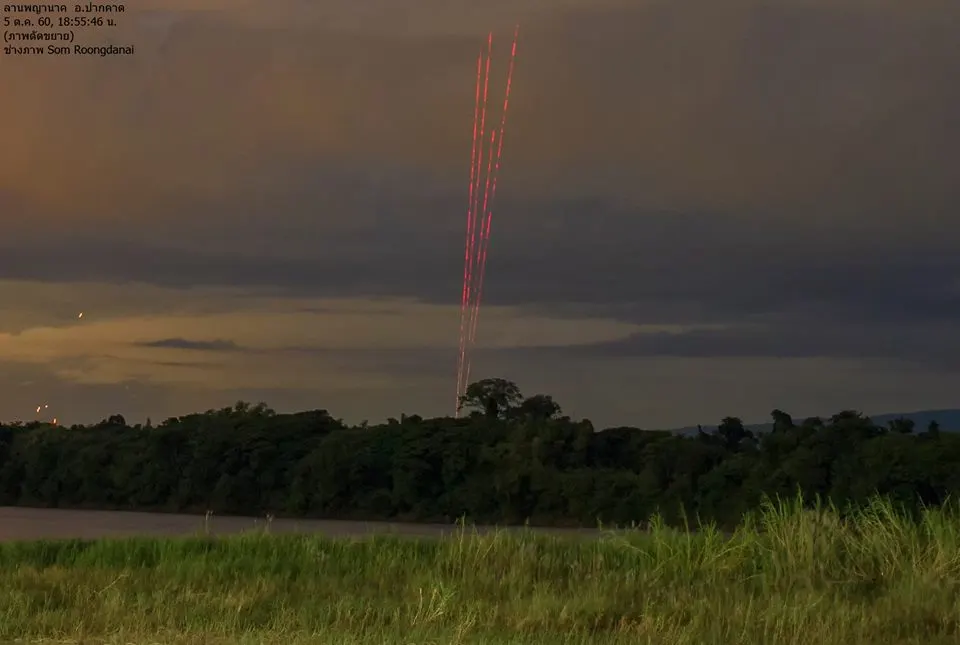 ถกสนั่น!! บั้งไฟพญานาคเหมือนลากจากผิวน้ำเข้าไปในป่า (ชมคลิป)