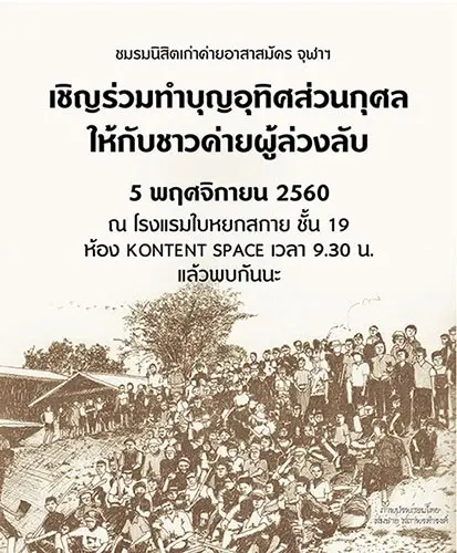 นายสถาน สุธรรมสมัย แห่งชมรมนิสิตเก่าค่ายอาสาสมัคร จุฬาลงกรณ์มหาวิทยาลัย ขอเชิญชาวค่ายจุฬาฯ ทุกรุ่นไปร่วมงานทำบุญ และอุทิศส่วนกุศลให้กับชาวค่ายผู้ล่วงลับ ในวันอาทิตย์ที่ 5 พฤศจิกายน 2560 ตั้งแต่เวลา 9.30 น. เป็นต้น ไป ณ โรงแรมใบหยกสกาย ห้อง Kontent Space ชั้น 19 ประตูน้ำ ถนนราชปรารภ