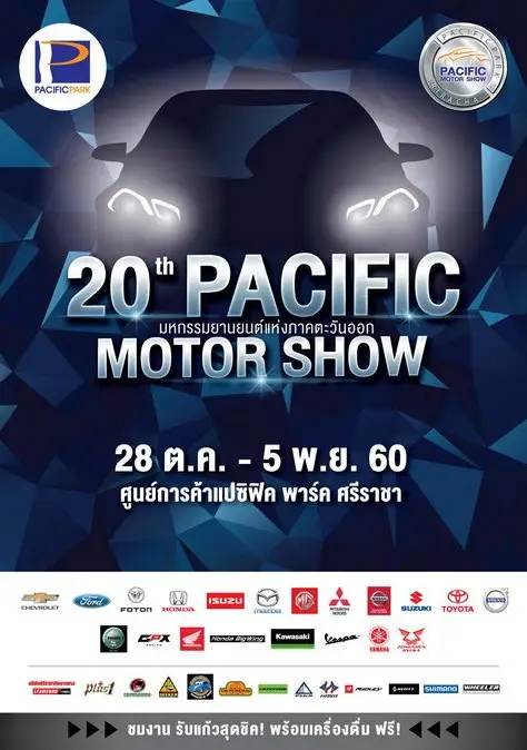 คนรักรถทั้งหลายเตรียมตัวให้พร้อมกับงาน PACIFIC MOTOR SHOW ครั้งที่ 20ศูนย์การค้าแปซิฟิค พาร์ค ศรีราชา จัดงานสุดยอดมหกรรมยานยนต์แห่งภาคตะวันออก ภายในงานพบกับ รถยนต์, พริตตี้ และการพาเหรดค่ายชั้นนำอาทิ Chevrolet, Ford, Foton, Honda, Isuzu, Mazda, MG, Mitsubishi, Nissan, Suzuki, Toyota, Volvo และจักรยานยนต์ Benelli, Honda, Honda BigWing, Kawasaki, KTM, Vespa, Yamaha และ RYUKA กับโปรโมชั่นที่ดีที่สุดแห่งปี