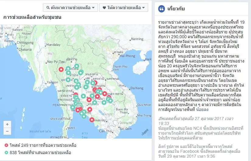 เมื่อวานนี้ 28 ตุลาคม “Crisis Response” ระบบเตือนภัยใหม่ของ facebook ได้แจ้งเตือนขึ้นมาใจความว่า “รายงานข่าวล่าสุดระบุว่า เกิดเหตุน้ำท่วมในพื้นที่ 19 จังหวัดในภาคกลางและภาคเหนือของประเทศไทย และส่งผลให้มีผู้เสียชีวิตอย่างน้อยสิบราย ผู้ประสบภัยกว่า 290,000 คนได้รับผลกระทบจากระดับน้ำที่ท่วมสูงในจังหวัดต่าง ๆ ได้แก่ จังหวัดเชียงใหม่ ตาก สุโขทัย พิจิตร นครสวรรค์ อุทัยธานี สิงห์บุรี ลพบุรี อ่างทอง อยุธยา ปทุมธานี ชัยนาท สุพรรณบุรี หนองบัวลำภู ขอนแก่น มหาสารคาม กาฬสินธุ์ ร้อยเอ็ด และอุบลราชธานี ประชาชนอย่างน้อย 20 ครอบครัวในจังหวัดขอนแก่นได้รับการอพยพ และน้ำที่ล้นนั้นได้รับการปล่อยออกมาจากเขื่อนอุบลรัตน์ มีรายงานก่อนหน้านี้ว่า จังหวัดอยุธยาได้รับผลกระทบเป็นบางส่วน โดยในเขตอำเภอพระนครศรีอยุธยา บางปะอิน บางบาล ผักไห่ บางไทร และอำเภอเสนาได้รับการประกาศให้เป็นเขตภัยพิบัติ พื้นที่ที่ได้รับความเดือดร้อนมากที่สุดอยู่คือพื้นที่ที่อยู่ติดริมแม่น้ำเจ้าพระยา แม่น้ำน้อย และคลองสายหลักต่าง ๆ คาดว่าจะมีการติดขัดในการสัญจรในบางพื้นที่” ดูเพิ่มเติมได้ที่ “อุทกภัยใน Thailand”