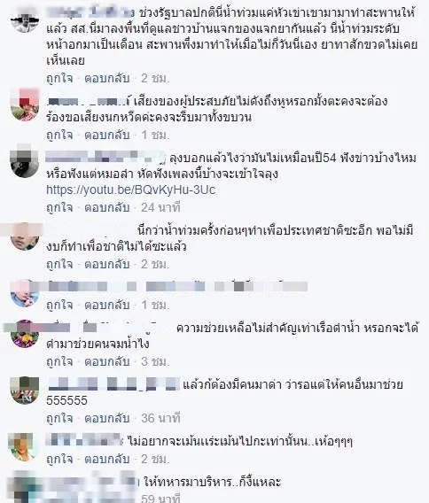 ชาวสามโคก ตำบลบางเตย อำเภอสามโคก จังหวัดปทุมธานีเผย การช่วยเหลือล่าช้าและลำบากมาก เผยได้มาม่าเพียง 5ซองและน้ำเปล่า 1 แพค หลังน้ำท่วมขังนานกว่าเดือน แต่การช่วยเหลือล่าช้าและเทียบย้ำท่วมเมื่อปี 54 ใกล้เคียงกัน จากการตรวจสอบพบว่าระดับน้ำบางจุดท่วมสูงเกือบ 1 เมตร แต่การช่วยเหลือแตกต่างกันมาก อ้างไม่มีงบประมาณ