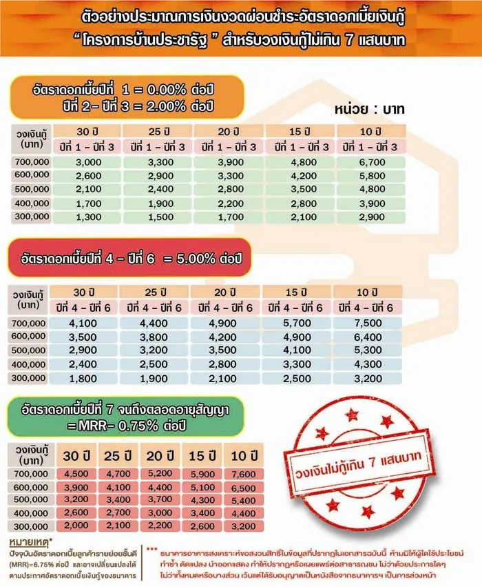 * กรณีปีที่ 7 เป็นต้นไป ธอส. คิดอัตราดอกเบี้ย MRR–0.75% ต่อปี สำหรับลูกค้ารายย่อยทั่วไป และ MRR–1% ต่อปี สำหรับลูกค้าสวัสดิการ