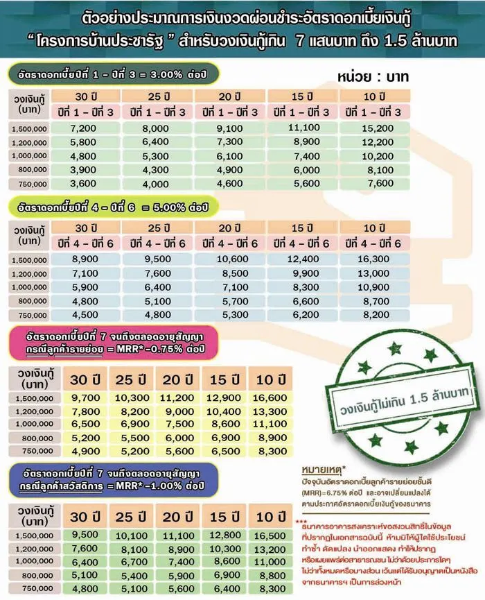 ปีที่ 7 – ปีที่ 30 อัตราดอกเบี้ยลอยตัว = MRR-0.75% ต่อปี