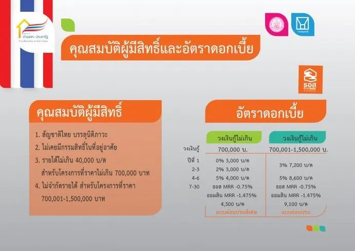 ผู้ขอสินเชื่อจะต้องมีอายุ 20 ปีขึ้นไป ระยะเวลาชำระเงินกู้ไม่เกิน 65 ปี ส่วนการซื้อบ้าน เช่าซื้อ หรือสร้างใหม่ ราคาหลังละไม่เกิน 1.5 ลบ. และเป็นบ้านหลังแรกเท่านั้น โดยผู้ขอสินเชื่อ ต้องไม่เคยมีชื่อเป็นเจ้าของบ้านมาก่อน ยกเว้นว่า จะเป็นการซ่อมแซมหรือต่อเติมที่อยู่อาศัย รวมทั้งผู้ขอสินเชื่อ ต้องไม่มีชื่อเป็นหรือเคยเป็น “เจ้าบ้าน” ในทะเบียนบ้านที่นำมาแสดงเป็นหลักฐานการยื่นกู้กับธนาคาร และต้องมีชื่อเป็น “ผู้อยู่อาศัย” ในทะเบียนบ้านไม่น้อยกว่า 3 ปี ยกเว้น มีชื่อเป็นเจ้าบ้านแต่พิสูจน์ได้ว่าไม่มีกรรมสิทธิ์ในที่อยู่อาศัยตามทะเบียนบ้านนั้น