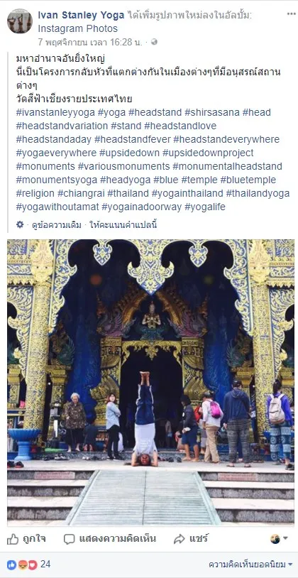 ทีนี้พอเขามาเที่ยวไทย มาวัดแถวเชียงราย แล้วถ่ายภาพโยคะแบบที่เขาทำตามปรกติ แต่มาทำหน้าวัด คนก็มองว่าไม่เหมาะสมแล้วแคปภาพไปด่ารัวๆ อันนี้ก็พอเข้าใจเพราะวัฒนธรรมบ้านเราถือว่าเท้าเป็นของต่ำ ไม่ควรยกไว้สูง หรือใกล้ๆกับพระพุทธรูป วัด ที่คนไทยถือเป็นของสูง ไรงี้ แต่ในมุมของคนที่เล่นโยคะ ท่าแนวๆ Salamba Sirsasana แบบนี้ถือเป็นท่าระดับสูงมาก
