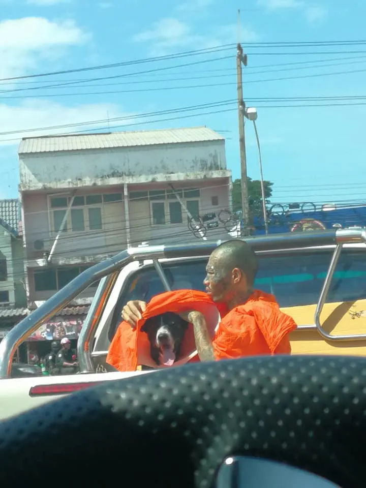 ประทับใจทั้งโซเชียล!! พระสงฆ์ นั่งท้ายกระบะเอาจีวรคลุมหัวบังแดดให้ เจ้าหมาน้อย