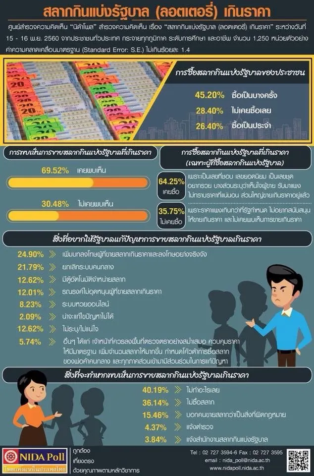 ศูนย์สำรวจความคิดเห็น “นิด้าโพล” สถาบันบัณฑิตพัฒนบริหารศาสตร์ (นิด้า) เปิดเผยผลสำรวจความคิดเห็นของประชาชน เรื่อง “สลากกินแบ่งรัฐบาล (ลอตเตอรี่) เกินราคา” ทำการสำรวจระหว่างวันที่ 15 – 16 พฤศจิกายน 2560 โดยสอบถามความคิดเห็นจากประชาชนทั่วประเทศ กระจายทุกภูมิภาค ระดับการศึกษา และอาชีพ รวมทั้งสิ้น จำนวน 1,250 หน่วยตัวอย่าง เกี่ยวกับสลากกินแบ่งรัฐบาล (ลอตเตอรี่) เกินราคา