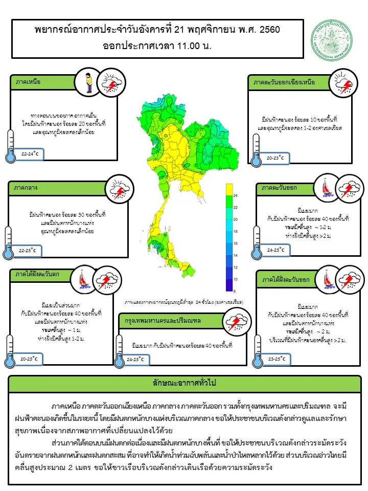 ประกาศ ณ วันที่ 21 พฤศจิกายน พ.ศ. 2560 เวลา 11.00 น. กรมอุตุนิยมวิทยาจะออกประกาศฉบับต่อไปใน วันที่ 21 พฤศจิกายน พ.ศ. 2560 เวลา 17.00 น.