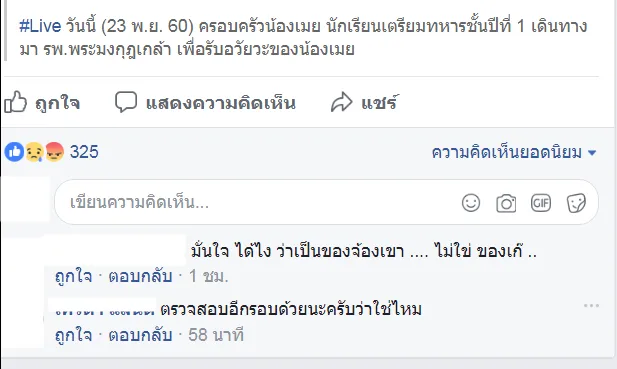 #Live วันนี้ (23 พ.ย. 60) ครอบครัวน้องเมย นักเรียนเตรียมทหารชั้นปีที่ 1 เดินทางมา รพ.พระมงกุฎเกล้า เพื่อรับอวัยวะของน้องเมย