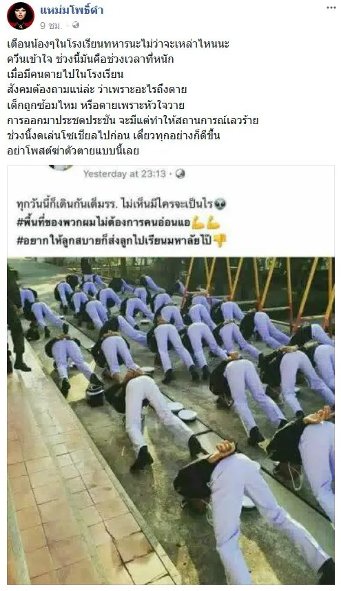 จากเหตุการณ์เสียชีวิตของนักเรียนเตรียมทหารภคพงศ์ ตัญกาญจน์ ที่ทางญาติยังติดใจคำอธิบาย ประเด็นการเสียชีวิต ว่าเกิดเหตุการอะไรก่อนเสียชีวิต จนกลายเป็นกระแสวิพากษ์วิจารณ์อย่างมาก ล่าสุดผู้ที่อ้างเป็นนักเรียนเตรียมทหารรายหนึ่ง โพสท์รูปกลุ่มนักเรียนทำท่าปักหัว พร้อมข้อความดุเดือด โดยได้โพสท์ไว้ว่า