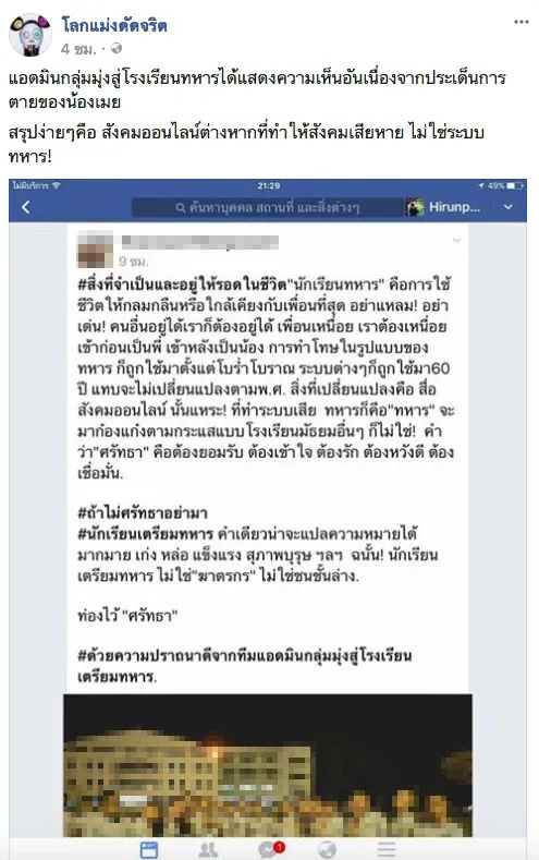 สืบเนื่องจากกรณีการเสียชีวิตของ "น้องเมย" นักเรียนเตรียมทหาร ล่าสุด 25 พ.ย. 2560 เพจ โลกแม่งดัจริต ได้นำโพสต์ที่ระบุว่าเป็นของแอดมินในกลุ่มมุ่งสู่โรงเรียนทหาร มาเผยแพร่ ดังนี้