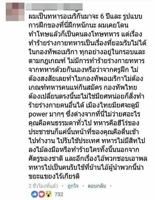 อีกทั้งในโพสต์ดังกล่าวยังมีผู้มาแสดงความเห็นของบุคคลหนึ่งที่อ้างว่าเป็นทหารอเมริกัน ได้แสดงความไว้ว่า เป็นทหารอเมริกันมา 6 ปี รูปแบบการฝึกของที่นี่นั้นหนัก เคยโดยทำโทษโดยทหาร แต่เรื่องทำร้ายร่างกายทหาร เป็นเรื่องที่ยอมรับไม่ได้ในกองทัพอเมริกา ทุกอย่างอยู่ในกรอบและตามกฎเกณฑ์ ไม่มีการทำร้ายร่างกายทหาร จากทหารด้วยกันเองหรือครูฝึก ไม่ต้องสงสัยเลยทำไมกองทัพอเมริกาไม่ต้องเกณฑ์ทหาร คนแห่กันสมัคร