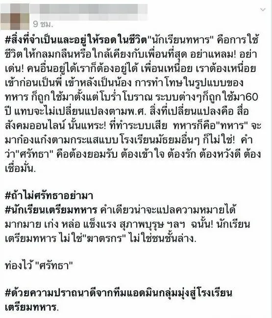 กรณีที่มีผู้ใช้เฟซบุ๊ก อ้างตัวเป็นแอดมินกลุ่มมุ่งสู่งโรงเรียนเตรียมทหารออกมาโพสต์วิธีการอยู่รอดในโรงเรียนเตรียมทหาร คือ ไม่ให้ทำตัวเด่นหรือแหลม รวมทั้งพูดในลักษณะว่า นักเรียนเตรียมทหาร เก่ง หล่อ แข็งแรง สุภาพบุรุษ ไม่ใช่ฆาตกร ไม่ใช่ชนชั้นล่าง จนทำให้เกิดการวิจารณ์อย่างหนัก