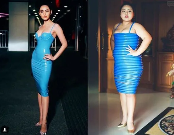 หลังจากเลียนแบบท่าโพส ‘ใหม่ ดาวิกา’ ในชุดราตรีสีดำ แต่เปลี่ยนจากสร้อยคอไข่มุก เป็นไส้กรอก