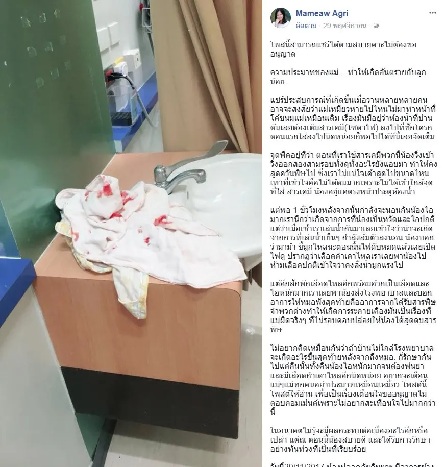 เป็นเรื่องราวที่ทุกครอบครัวที่มีเด็กเล็กต้องระวัง แต่ในกรณีนี้ผู้ใหญ่ก็ต้องระวังเช่นกัน กับการแก้ไขปัญหาท่อตัน ชักโครกตัน ด้วยวิธีการใช้สารเคมี อาจเป็นอันตรายต่อสมาชิกในบ้านได้ โดยคุณ Mameaw Agri ได้เตือนให้เป็นอุทาหรณ์ว่า