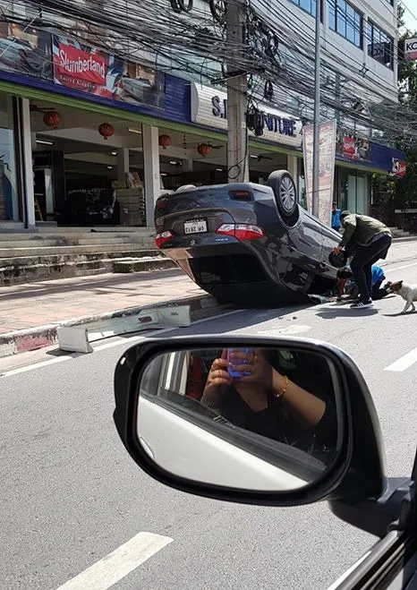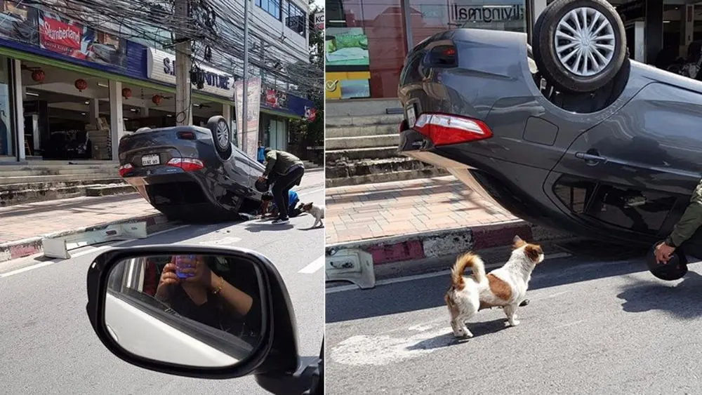 ตกใจอ่ะ ต่อหน้าเลย หลบหมาชนฟุตบาตพลิกคว่ำ ดูไอ้ตัวต้นเหตุในรูปมายืนดูด้วย