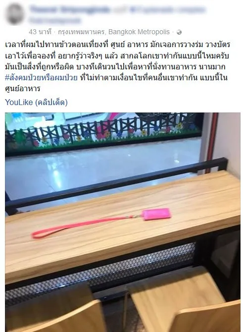 หลายคนอาจจะเคยเจอการจองที่จอดรถหน้าร้านห้องแถว ล่าสุดถึงขั้นจองโต๊ะกินข้าวในศูนย์อาหารกันแล้ว หนุ่มคนหนึ่งทนไม่ไหวโพสท์ถามว่าปกติเค้าทำกันแบบนี้เหรอ โดยได้โพสท์ไว้ว่า