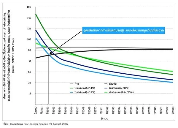 การวิเคราะห์ของ Bloomberg New Energy Finance ต้นทุนการผลิตไฟฟ้าต่อหน่วยไฟฟ้าปรับเฉลี่ยที่ ผลิตได้จากระบบโซล่าร์เซลล์ (ในระดับ utility scale) จะเท่ากับหรือถูกกว่าถ่านหินไม่เกินปี 2563 Bloomberg ระบุว่าในช่วง 25 ปีข้างหน้า ในจำนวนมูลค่าการลงทุนใหม่ในภาคพลังงานของไทยประมาณ 80,000 ล้านเหรียญสหรัฐฯ ร้อยละ 48 จะเป็นการลงทุนด้านพลังงานแสงอาทิตย์และลม แผนที่ที่ตีพิมพ์ล่าสุดโดย Bloomberg ชี้ให้เห็นว่าต้นทุนของเซลล์แสงอาทิตย์ในประเทศไทย จะลดลงอย่างน้อยร้อยละ 50 ภายในปี พ.ศ.2583
