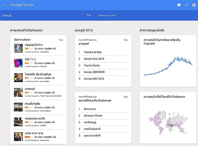 เปิดให้บริการแล้วสำหรับบริการ Google Trends ที่อัพเกรดเพิ่มขึ้น ซึ่งเป็นบริการที่จะช่วยให้ทุกคนสามารถติดตามว่าผู้คนค้นหาข้อมูลต่างๆ อะไรบ้างในแบบเรียลไทม์ โดยใช้ข้อมูลร่วมกันกับบริการอื่นๆ ของ Google ด้วยเช่น Google News, Shopping, Images และ YouTube