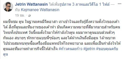 ผมชื่นชม ตูน ในฐานะคนมีจิตอาสา เราเข้าใจและรับรู้ถึงความตั้งใจของเค้าได้ สิ่งที่ตูนและทีมงานของเค้าทำ มันเกิดความหมายที่ดีมากมายสำหรับคนไทยทั้งประเทศ วันนี้ผมตั้งใจมาให้กำลังใจตูน ผมมาหาตูนแบบส่วนตัวๆกันเอง สบายๆ ทักทายแบบพี่ๆน้องๆ และได้ฝากเงินถึงมือตูน 1ล้านบาท ไปช่วยสมทบทุนซื้อเครื่องมือแพทย์ให้โรงพยาบาล และเพื่อเป็นกำลังใจให้ตูนและทีมงานทำภารกิจนี้ให้สำเร็จ #ก้าวคนละก้าว #jjetrin #ขอบคุณครับตูน