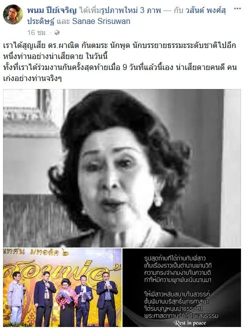 วันที่ 5 ธันวาคม 2560 เฟซบุ๊ก พนม ปีย์เจริญ เผยถึงข่าวเศร้าการจากไปของ ดร.ผาณิต กันตมระ นักพูด นักบรรยายธรรมะ ชื่อดัง ไว้ว่า