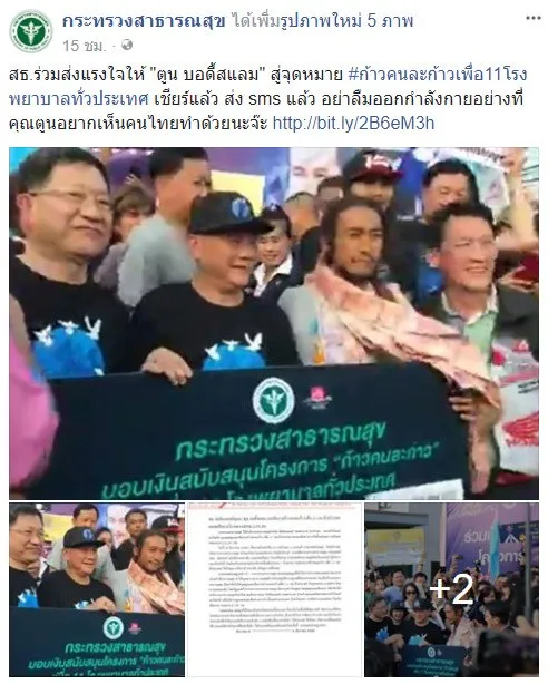 6 ธันวาคม 2560 เฟซบุ๊ก กระทรวงสาธารณสุข ได้มีการโพสต์ภาพเจ้าหน้าที่กระทรวงสาธารณสุข ได้มอบเงินบริจาคจำนวน 1 ล้านบาทให้ตูน บอดี้สแลม ในโครงการก้าวคนละก้าวเพื่อ 11 โรงพยาบาลทั่วประเทศ ด้านชาวเน็ตแซวว่ามันแปลกๆ กระทรวงสาธารณสุขบริจาคให้พี่ตูน เพื่อให้พี่ตูนบริจาคให้โรงพยาบาลต่อ?