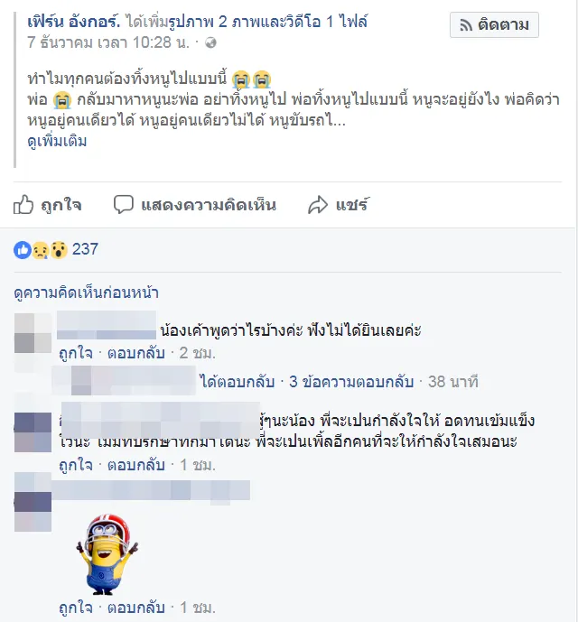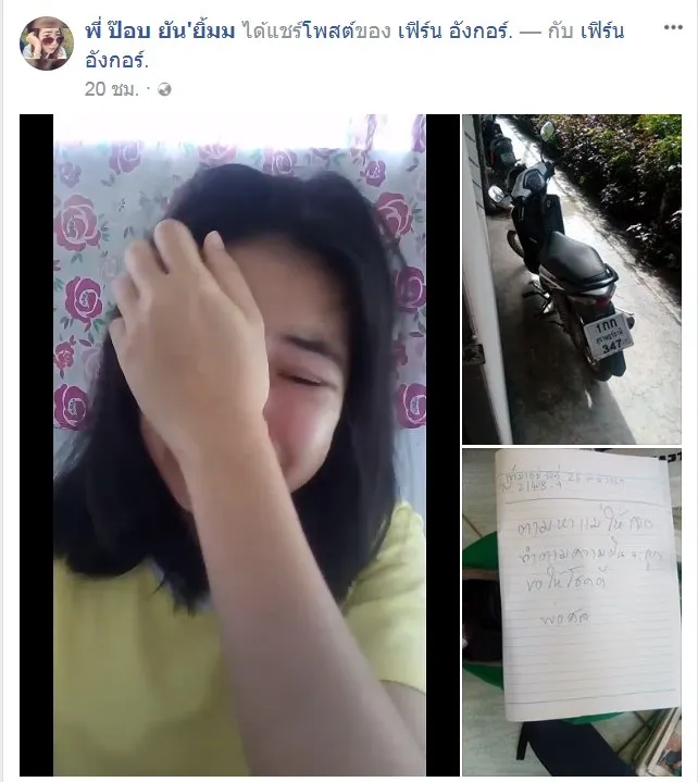 เฟซบุ๊คคุณ เฟิร์น อังกอร์.ไ โพสต์ข้อความและคลิปว่า ทำไมทุกคนต้องทิ้งหนูไปแบบนี้ พ่อ กลับมาหาหนูนะพ่อ อย่าทิ้งหนูไป พ่อทิ้งหนูไปแบบนี้ หนูจะอยู่ยังไง พ่อคิดว่าหนูอยู่คนเดียวได้ หนูอยู่คนเดียวไม่ได้ หนูขับรถไม่เป็น ทำไมพ่อทิ้งหนูไปแบบนี้ ทั้งที่หนูไม่คิดจะทิ้งพ่อ แม่ก็ทิ้งหนูไปแล้ว น้องก็ไม่ได้อยู่กับหนู แล้วพ่อจะยังทิ้งหนูไปอีก พ่อไม่สงสารหนูบ้างอ๋ออ กลับมาหาหนูนะพ่อ เอิร์น พ่อทิ้งพี่ไปแล้วนะ พ่อเขียนกระดาษกับทิ้งรถไว้ พ่อบอกว่า พ่อจะไม่อยู่แล้ว