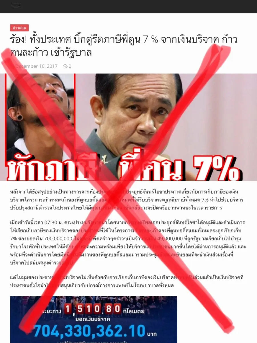 เมื่อวันที่ 10 ธ.ค.60 ผู้สื่อข่าวรายงานว่า โลกโซเชียลมีการแชร์เว็บไซต์คลิกเบทแห่งหนึ่ง ที่เผยแพร่ข่าวปลอมเกี่ยวกับ พลเอกประยุทธ์ จันทร์โอชา นายกรัฐมนตรี จะเก็บภาษีที่ได้จากโครงการก้าวคนละก้าวเพื่อ 11 โรงพยาบาล ของตูน บอดี้สแลม 7% จากรายได้ทั้งหมด 7 ร้อยล้านบาท รวมเป็นเงินถึง 49 ล้านบาท